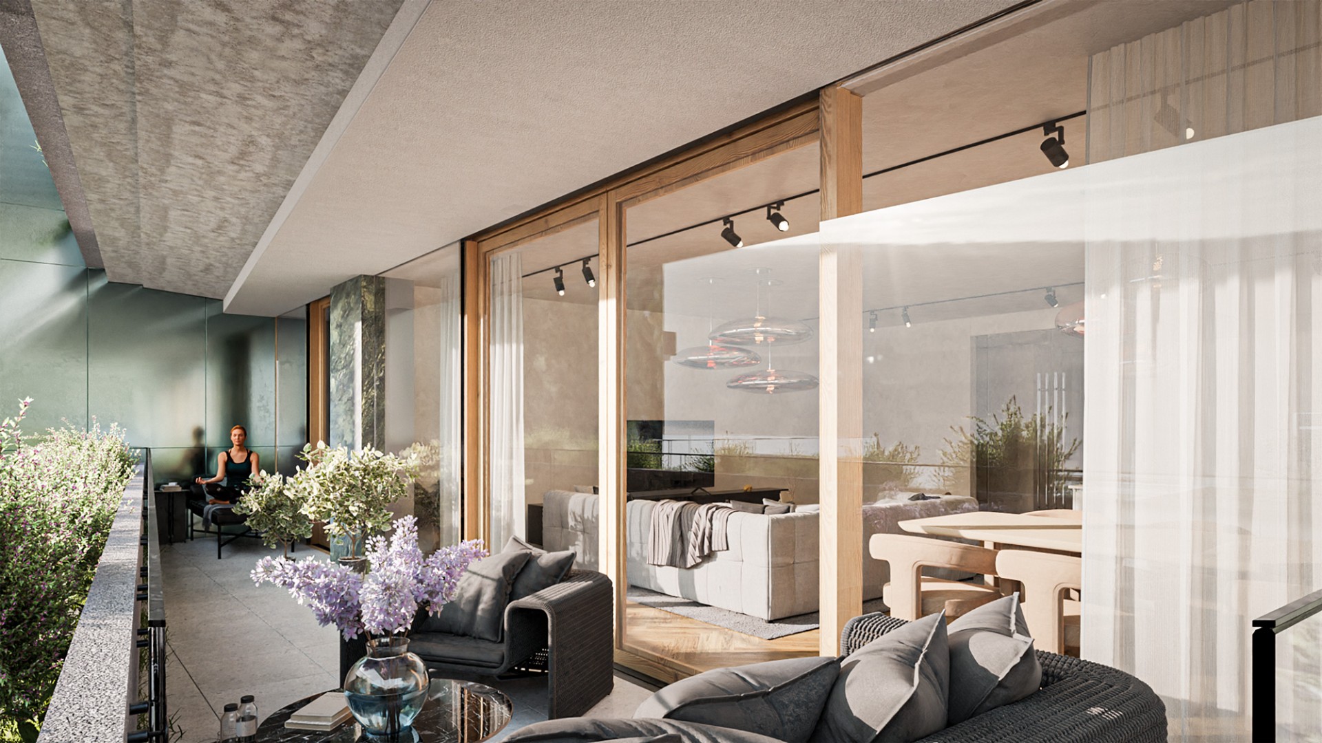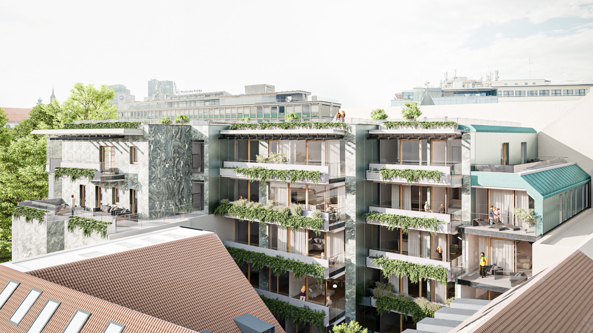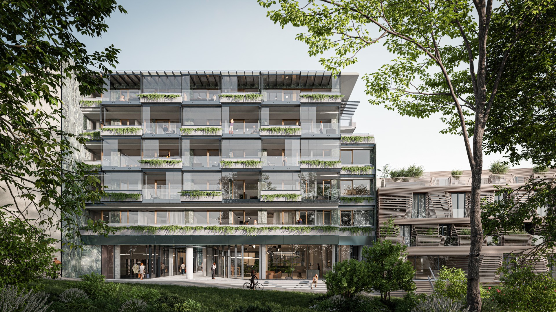 Pomemben člen arhitekturne zasnove je tudi fasada v kamnu v zelenem odtenku in velikimi cvetličnimi koriti iz katerih bo kipelo zelenje, ki nagovarja naravno rastlinsko okolico, ter jo z svojimi velikimi steklenimi površinamo tudi reflektira.