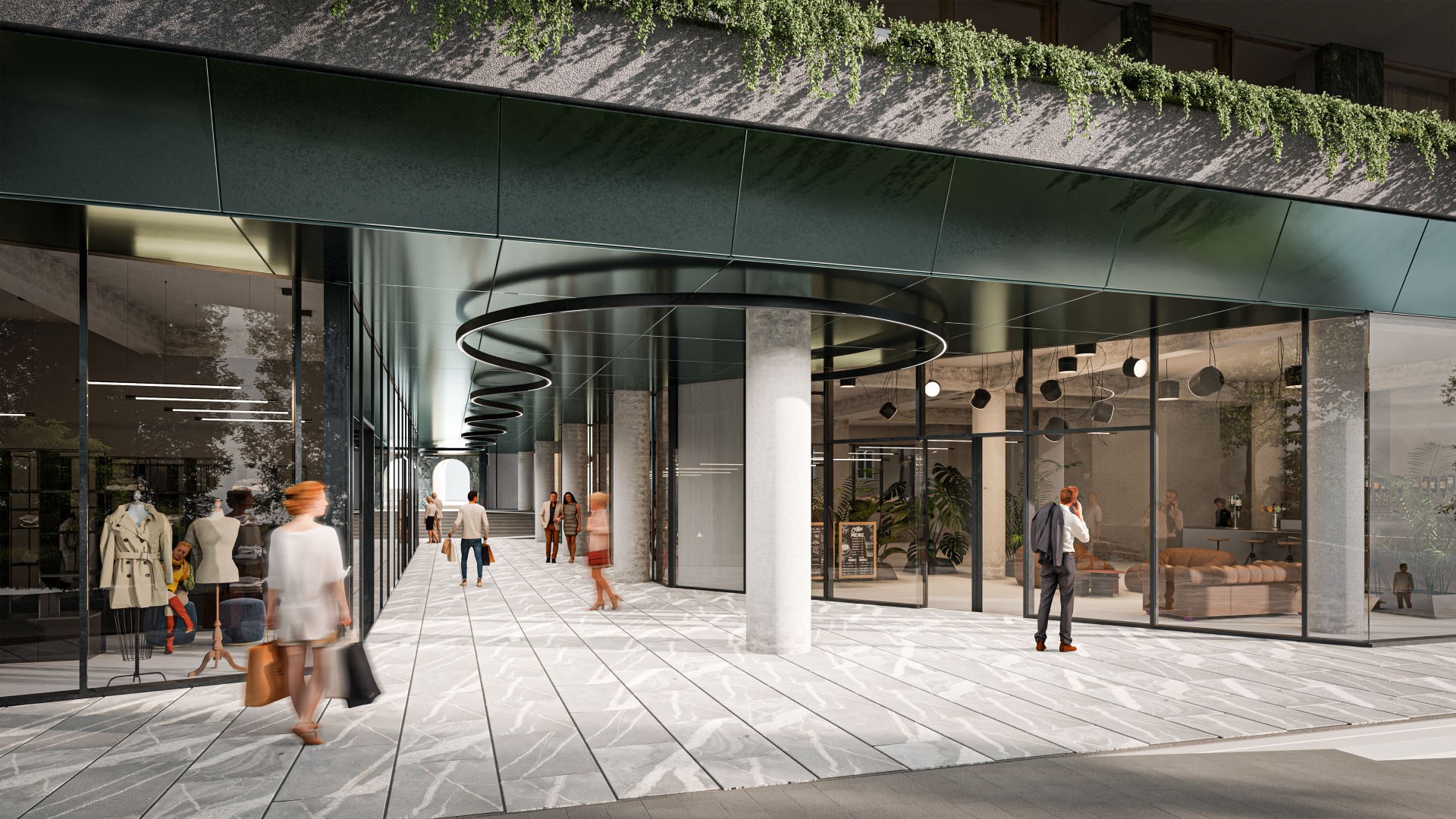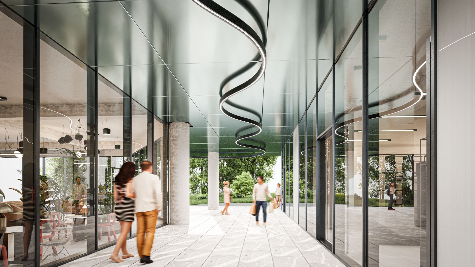 Pomembna arhitekturna poteza je prehod v pritličju, ki mimo na novo zasnovanih trgovin in lokala, povezuje Čopovo ulico na eni strani ter Knafljev prehod in park Zvezda na drugi strani, ter tako ustvari edinstven zeleni prehod skozi urbano tkivo.
